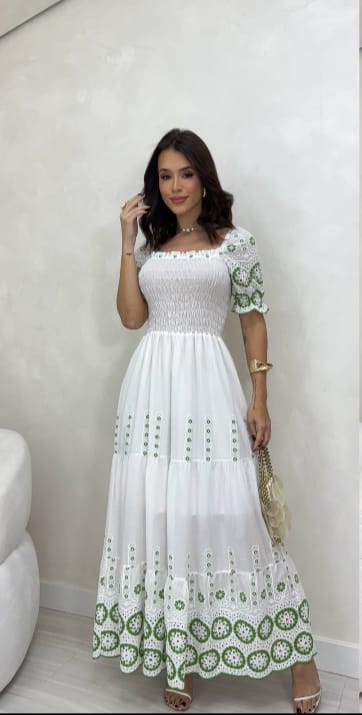 Vestido longo com três Marias , confeccionado no laise de algodão 100%. , com caimento perfeito no corpo