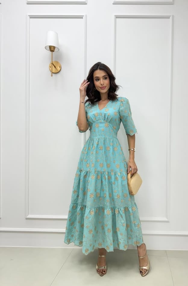 Vestido Flor caimento perfeito, Saia com babado e detalhes em bordado .